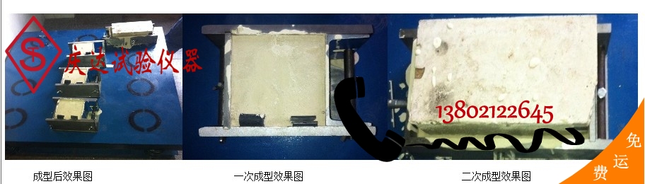 1、一次成型試模組裝后,用潤(rùn)滑油進(jìn)行抹刷,然后把磚試樣放入試模中,在中間和兩邊插入插板以確定厚度,前后方向用膠皮密封,初步擰緊螺絲固定試樣,取出插板,最終擰緊螺絲。把固定好樣品的試模放到振動(dòng)臺(tái)上加入專用凈漿制樣。